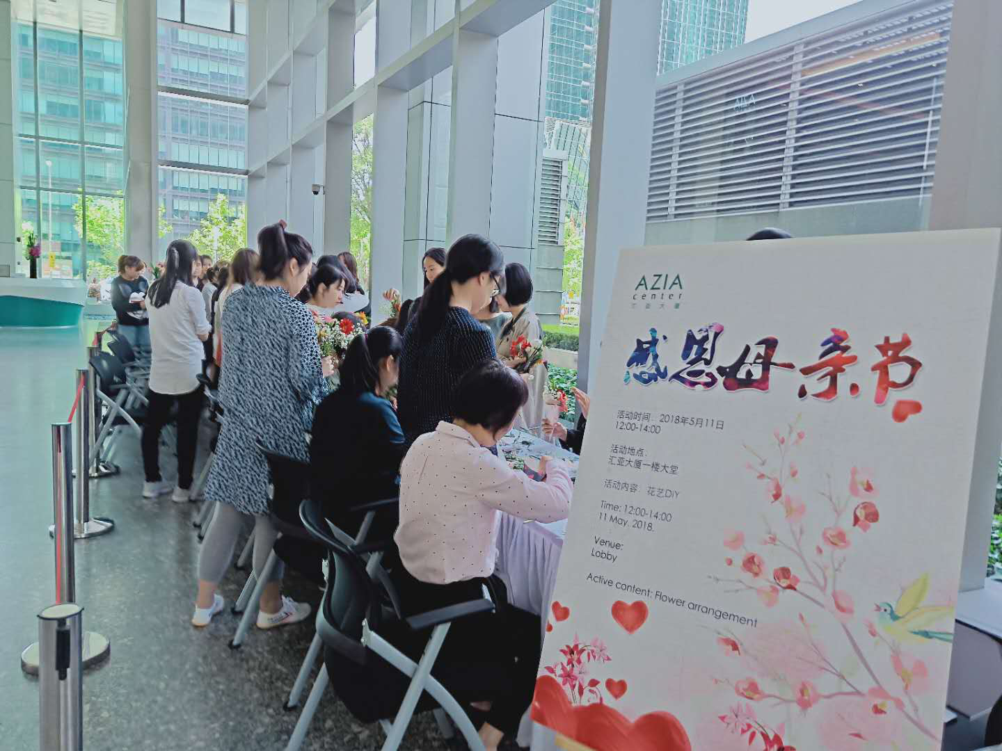 母亲节活动于2018年5月11日中午12:00-14:00在大厦一楼举行。我们准备了鲜花有专业老师指导花束DIY。本次活动非常成功。