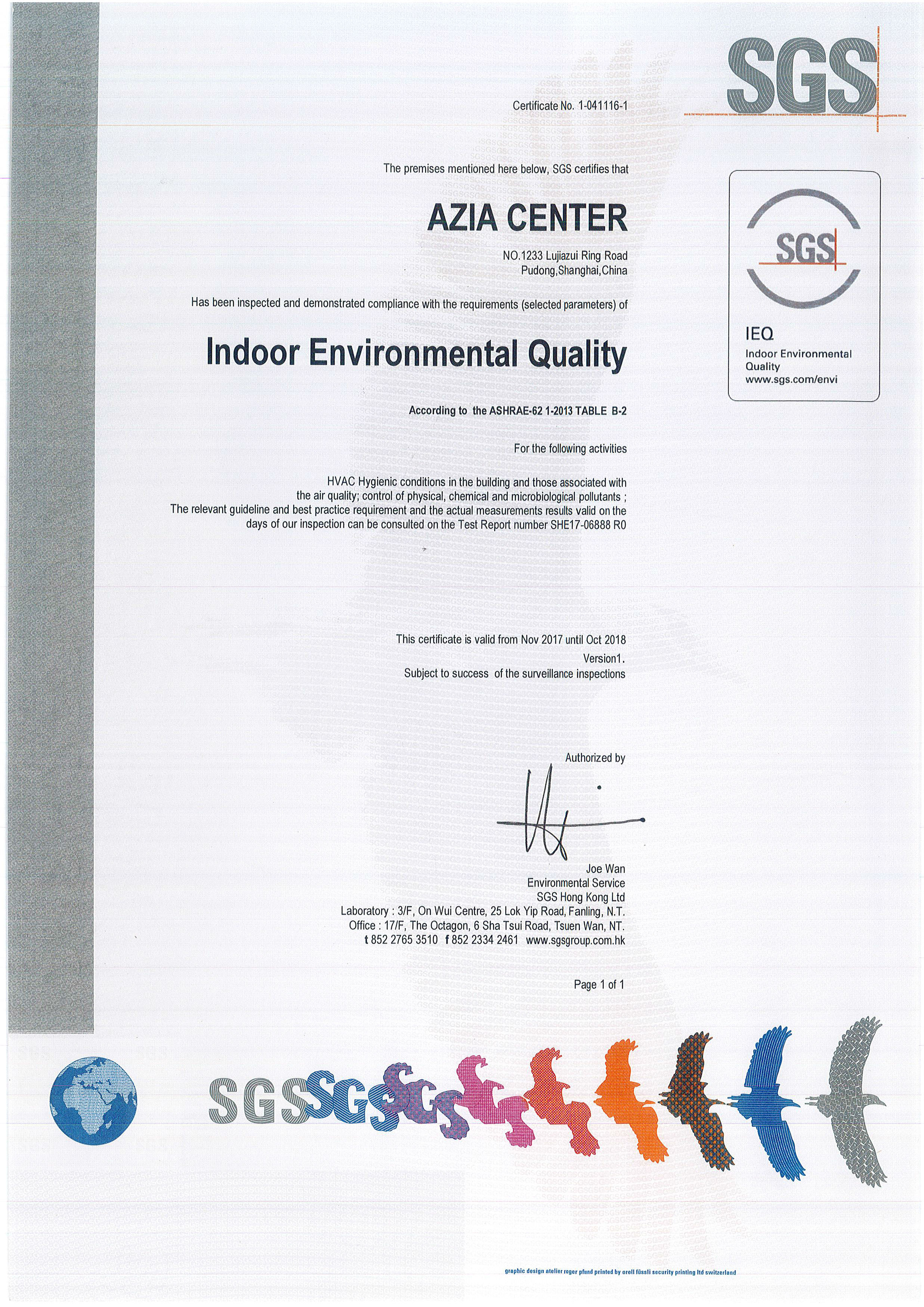 汇亚大厦整体空调系统配备高效过滤系统, 新风系统及回风系统均安装HEPA F7高效过滤网, 可有效过滤PM2.5颗粒及粉尘, 过滤效率高达90%以上。大厦整体空气质量优良, 符合美国空气净化标准(ASHRAE-62 1-2013), 每年均通过SGS空气质量检测并获得其认证证书。